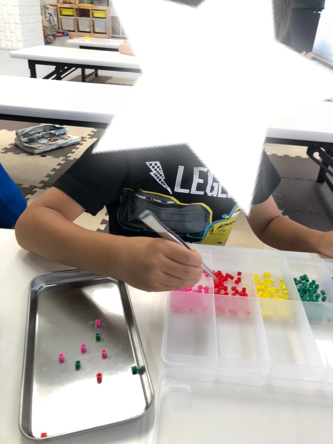 つるせ教室8(火)の活動は、個別活動で『指先トレーニング』を行いました。 今回は、5色のビーズが入っているトレーからピンセットを使って色別にビーズを仕分ける作業です✨ さぁ集中してやってみよう❗ ピンセット […]